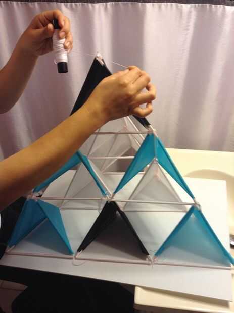 se trata de una cometa tetraédrica de 10 células, basada en el diseño de paja flexible de emilyfis.Materiales: (La mayoría normalmente se puede comprar en una tienda de dólar)Pajas flexiblePajitas rectasCinta de embalajeCinta Scotch4" mini abrazadera