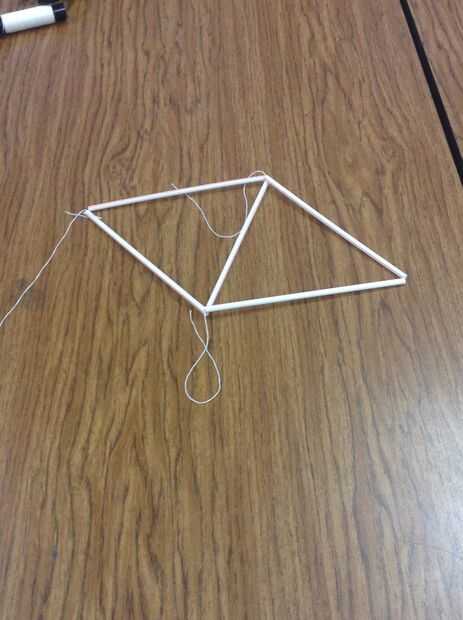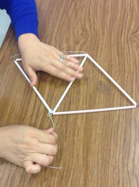 Después de que el triángulo está hecho y atado usar dos pajas más para medir la cadena restante para completar la pirámide. Dos pajillas paralelas a la cadena todavía conectado a la bobina y deja cerca de dos pulgadas después de la paja y cortar la cuerda de la bobina. Crear una forma de diamante con la paja usando la cadena restante para atar la paja de los dos últimos al triángulo que creó anteriormente. Recuerde atar nudos tantas como sea necesario para que la paja no desarmarse (generalmente por lo menos 2 nudos).