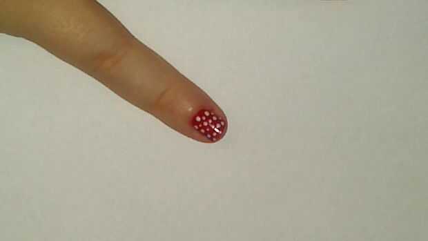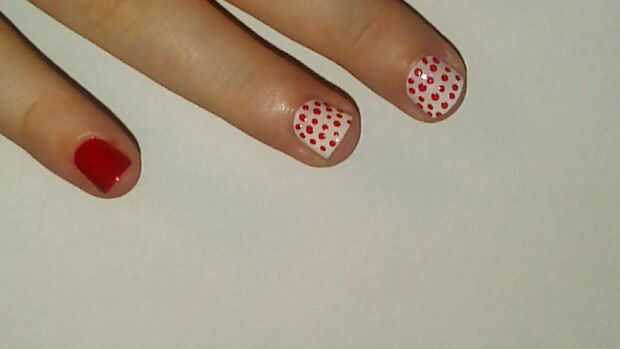Hacer puntos rojos en sus uñas pintadas de blanco y puntos blancos en las uñas pintadas rojo.