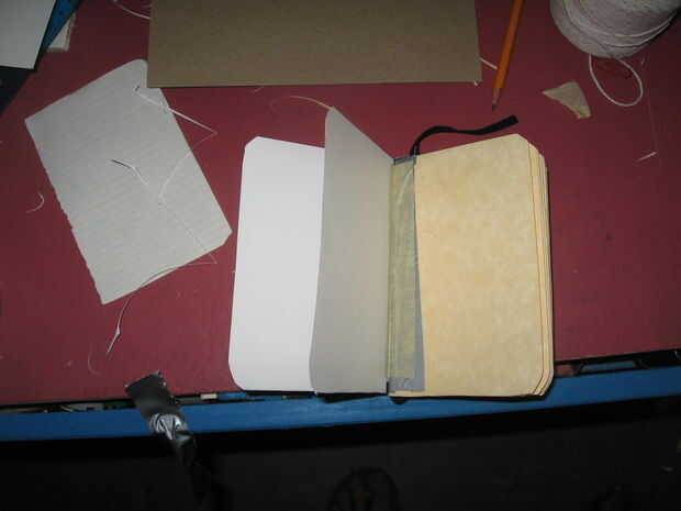 La cinta el lado exterior de la cartulina doblada a la columna, alineación de su columna vertebral la columna vertebral de la notebook.