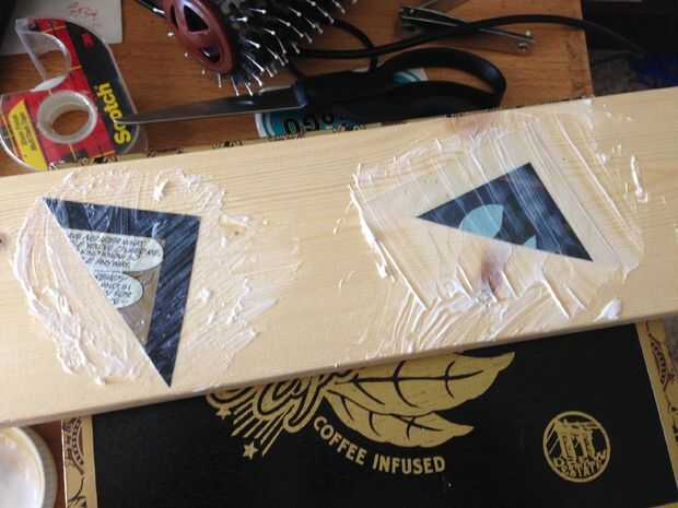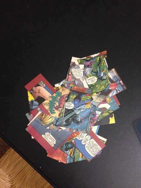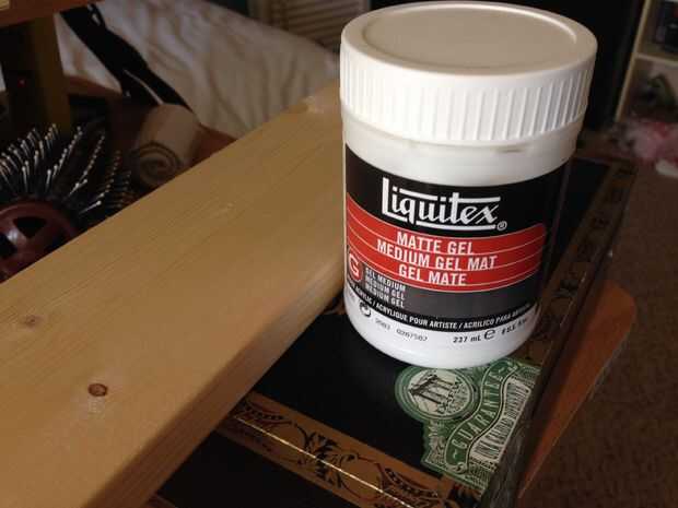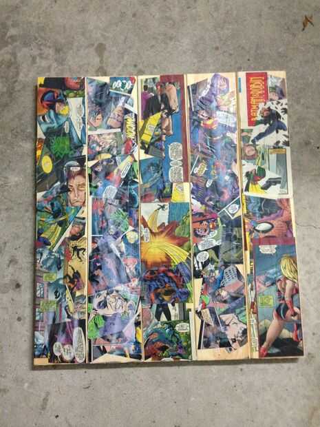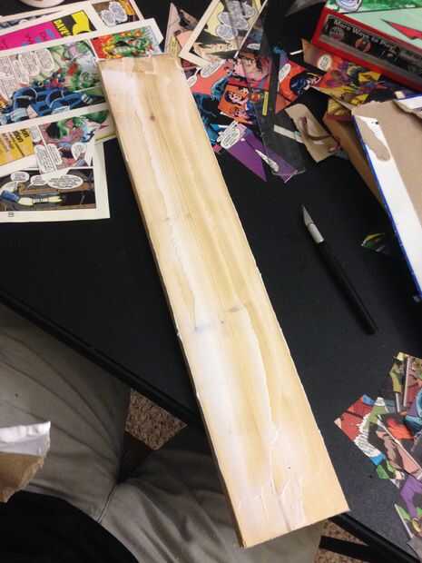 Acrílico mediano o mod podge tanto funcionaría para este propósito (y un montón de otras cosas, estoy seguro). He separado el medio a la madera una capa fina, trazado de piezas cortadas de páginas de cómic en la parte superior y había cubierto todo en otra capa de medio acrílico. Esto sellos en las páginas y hace que pegue mejor. Varias capas de este proceso probablemente sería buenas, pero sólo tenía suficientes páginas de cómic para hacer unas pocas capas.
