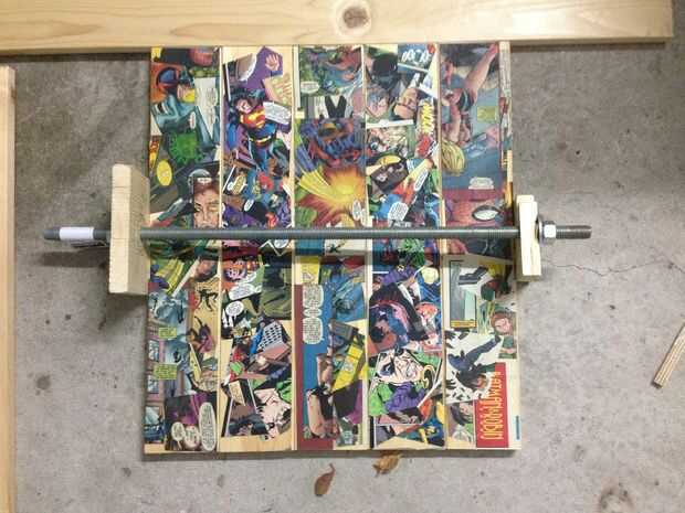 Para hacer las láminas individuales en una mesa, primero pegué los listones entre sí. Alineados lado a lado, difundir sólo un poco de pegamento en cada unión de la superficie y luego los sujeta con una abrazadera de improvisadas hecha de una varilla roscada, madera y frutos secos. No mucho pegamento se necesita; exceso de goteo sólo de voluntad y hacer que la madera se vea funky.