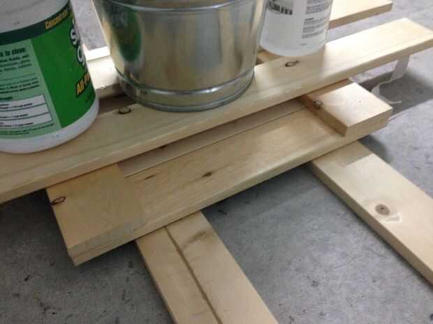 Mientras que el pegamento de madera es muy fuerte, todavía no confío en la integridad del pegamento para mantener un tablero de la mesa, así que pegué dos listones más en la parte inferior perpendicular. Yo los cargado abajo con las cosas más pesadas que pude encontrar en el garaje. Ningún equipo lujo aquí. Después de secado el pegamento, la mesa está hecha!