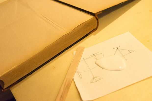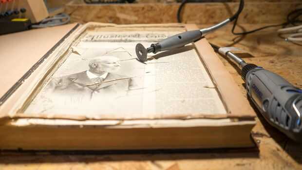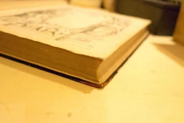 Tuve que buscar un poco un libro lo suficientemente grande como para caber el shzebang entero (17 pulgadas), pero encontré este hermoso libro antiguo. Casi además avergonzado cortar en él, pero guardan algunas de las bellas páginas.