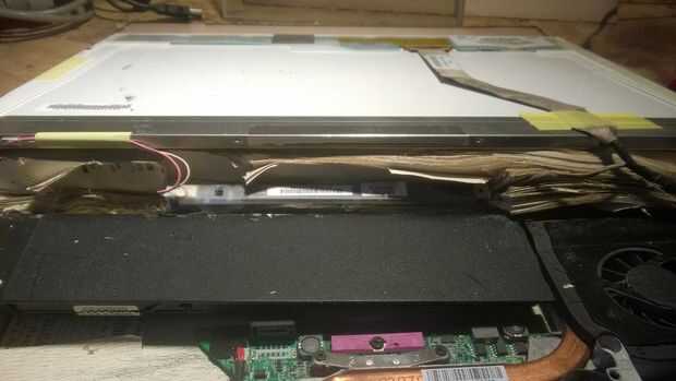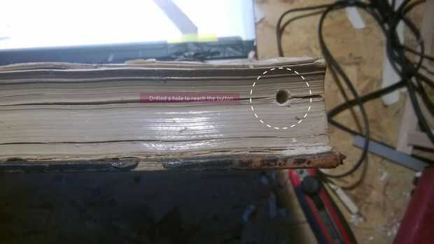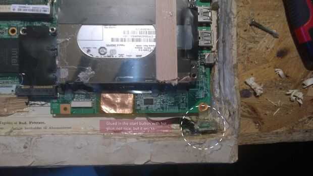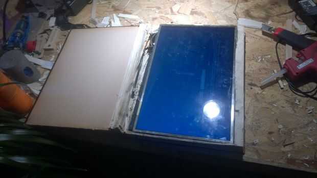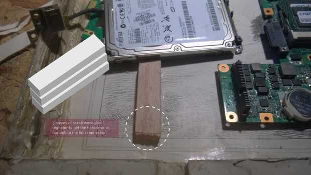 Pero todavía traté de mantenerla como espacio libre posible. He utilizado pegamento caliente y algunos pedazos de madera para hacer soporte para el hardware. Cuando todo estaba bien había instalado la pantalla y pegado todo abajo.