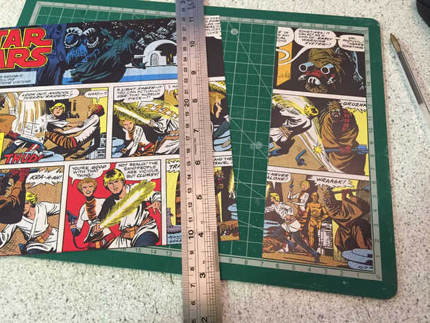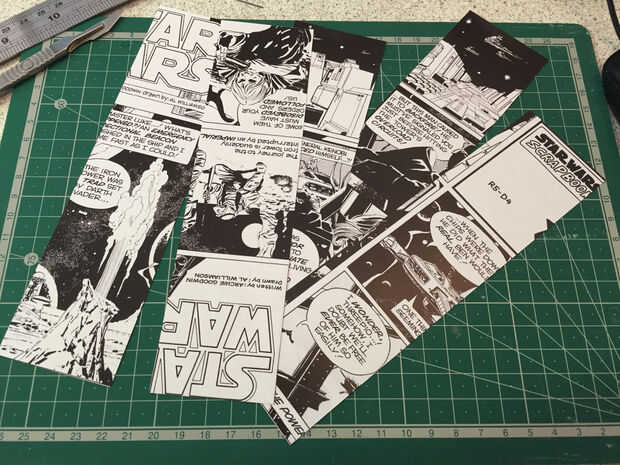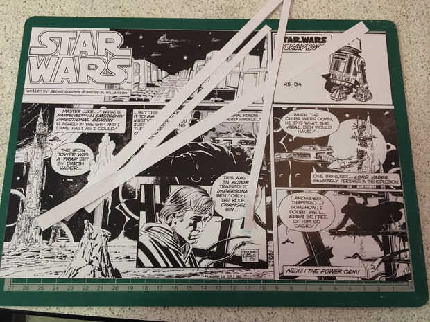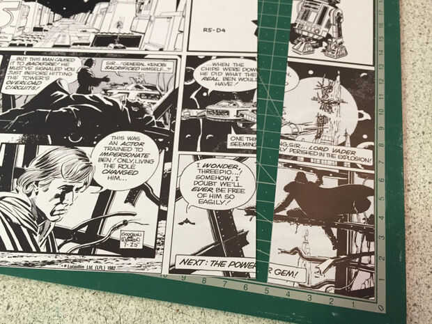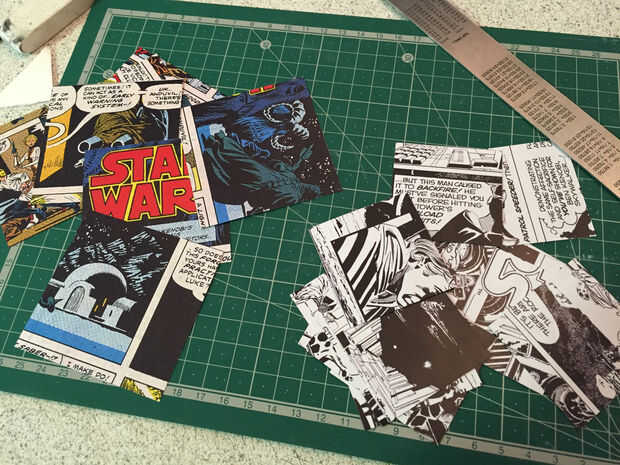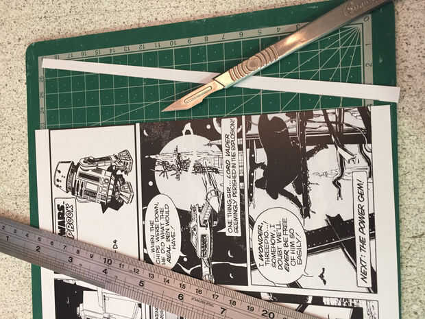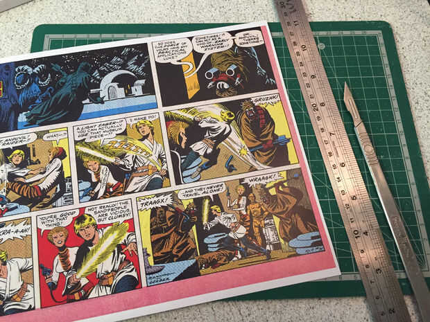 Lo primero que hice fue recortar los bordes de los papeles (como la impresora que utiliza no podía imprimir fronteras.) Recortado hasta el borde de los paneles cómicos no el color como queríamos ver como mucho de los cómics como sea posible.