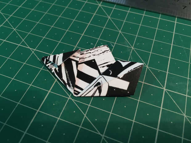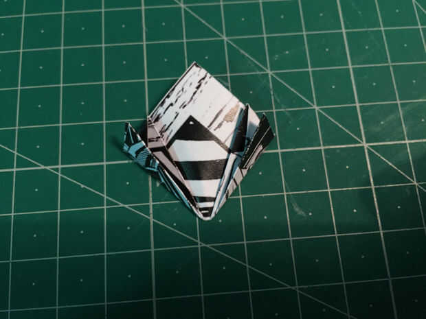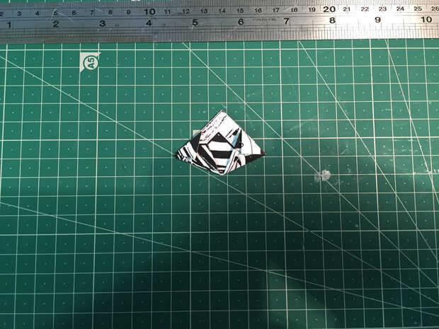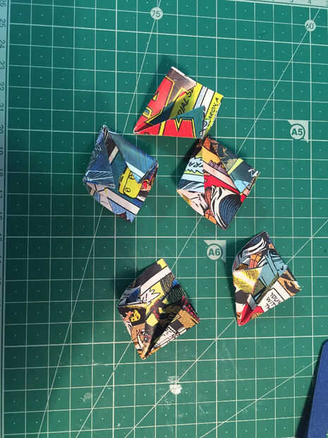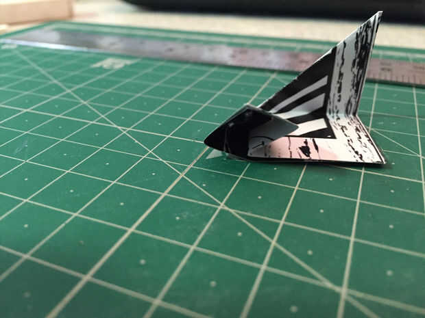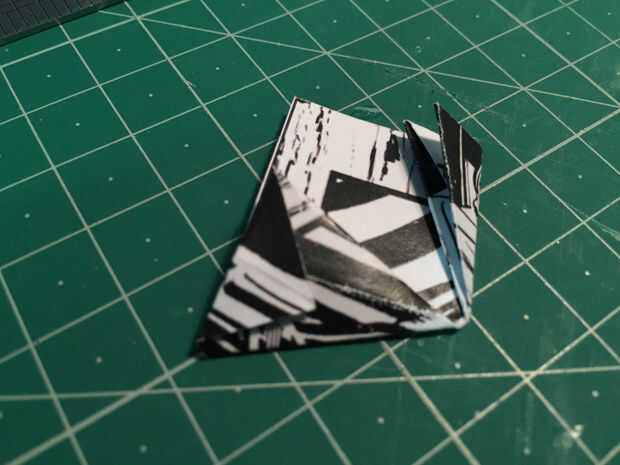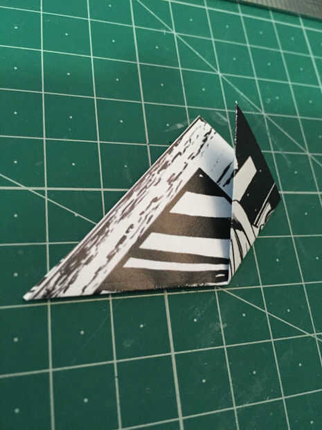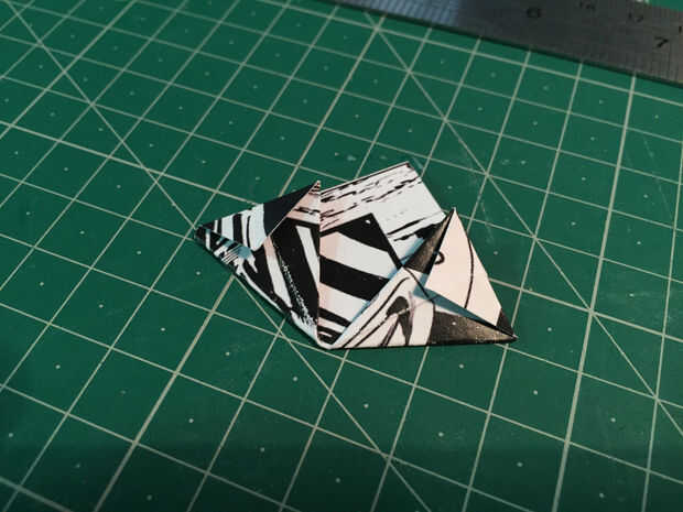 5. ahora dobla uno de los dos triángulos al revés, que acaba de hacer, por la mitad. (ver fotos). hacer esto a ambos lados.