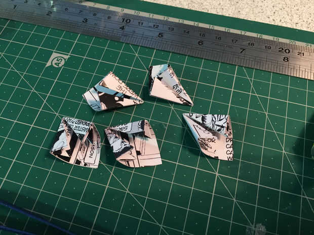 Tuvimos que hacer 14 completar ojales para la boda, por lo que significó que necesitábamos 70 color pétalos y pétalos blanco y negro 140. Hicimos mucho plegado y corte para la mayoría de nuestras noches por una semana o dos.