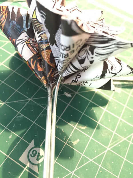 Repita el pegado sobre el alambre con los pétalos más pequeños de blanco y negro.