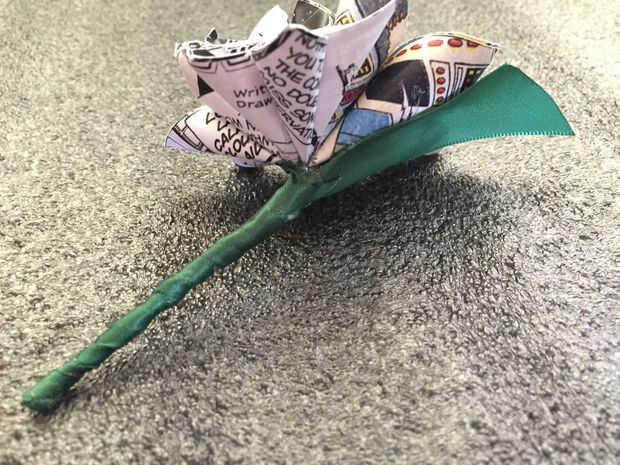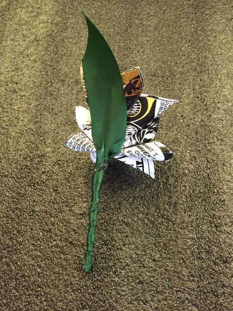 Utilizamos primero un gran trozo de cinta y cortar en forma de hoja y coloca en la parte posterior de la flor de color, esta cinta extendido abajo el vástago de una manera pequeña, así que cuando el tallo se envuelve cubrirá la hoja.