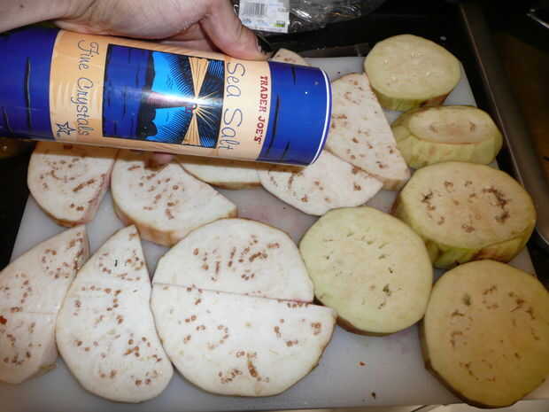 Ahora para ablandar la carne de las berenjenas es necesario sudar estas rebanadas. Colocar las rebanadas y espolvorear sal sobre ellos y dejarlos reposar ~ 15 minutos. Puede hacer el relleno mientras se tira el agua de la planta.