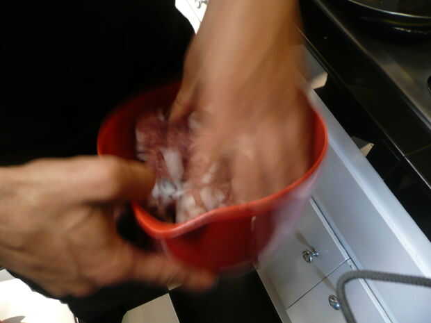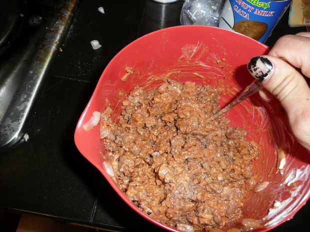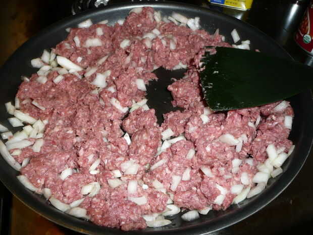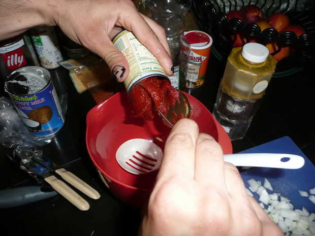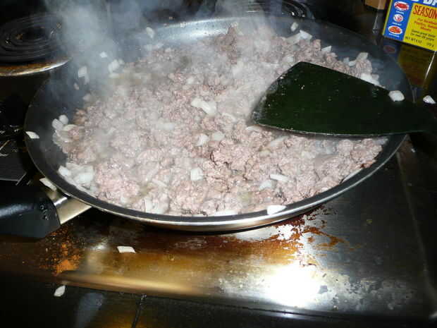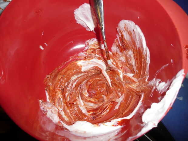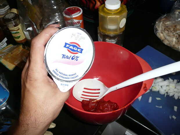 Ahora mezcla la lata de pasta de tomate con 1,5 tazas de yogurt griego. Añadir la mezcla de groundbeef cuando lo ha hecho cocinar y mezclar.