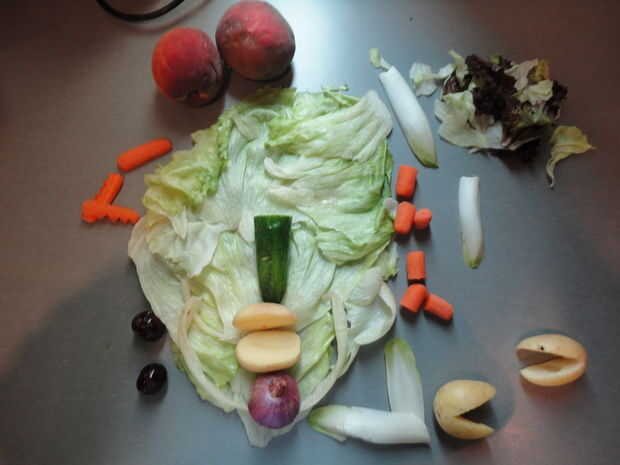 Lugar dos de la endibia hojas curva lejos de la cebolla para dar forma redondeada a la parte inferior de la cara.