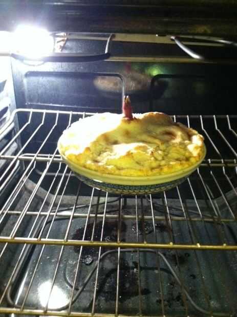 Después de 25 minutos reducir la temperatura a 350 grados y hornee por 20-30 minutos. Poner una bandeja para hornear galletas en una rejilla inferior para recoger cualquier goteo de la empanada. Mina cocino hasta que la corteza es de color dorado y los interiores son burbujas. Cubrir la corteza con papel de aluminio si empieza a quemar.