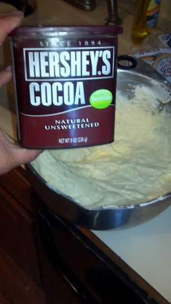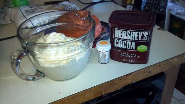 Azotó mi receta de glaseado favorito luego agregó sin azúcar de Hershey coco y una pizca de colorante alimenticio.