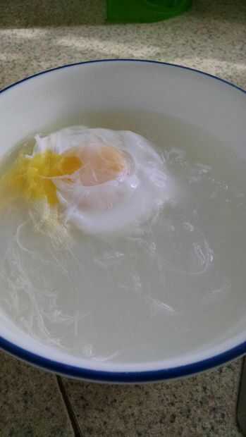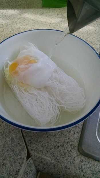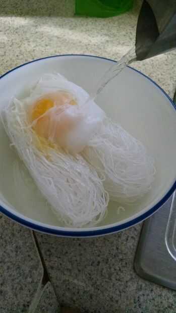 Verter el agua directamente en el huevo crudo. Donde los golpes de agua hirviendo, el huevo se cocinará allí. Mover el agua alrededor de tan diferentes partes del huevo Haz cocinado. Clara de huevo cruda no es tan sabroso - yema de huevo semi crudo es delicioso!