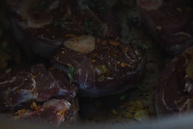 Añadir los nudillos de cordero a la cebolla picada y freír durante un tiempo.