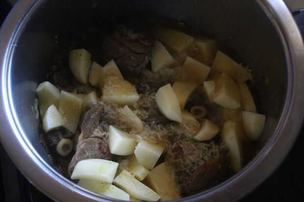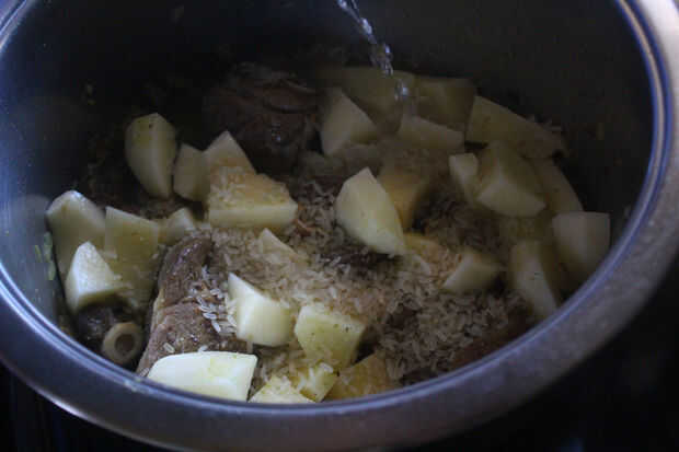 Después de que su carne se ha cocido un rato agregar tus papas picadas y el arroz. Añadir también su opción de poco de sal, especias y hierbas. Añadir un poco de agua. Más no se.