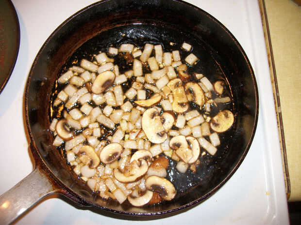 Puede agregar aceite de oliva un poco más en este momento si usted siente que el rehogar la necesitará. Después de rectificado y corte las cebollas y los champiñones, saltearlos en el aceite restante hasta que las cebollas estén transparentes. Ahora añadir el ajo, que ha sido preparado y picado y rehogar durante un par de minutos más.