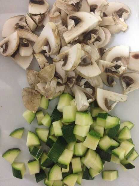 Mientras se está calentando el aceite, picar aproximadamente su berenjena, calabacitas y champiñones en cubos pequeños.