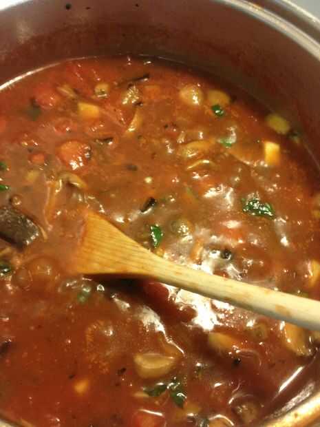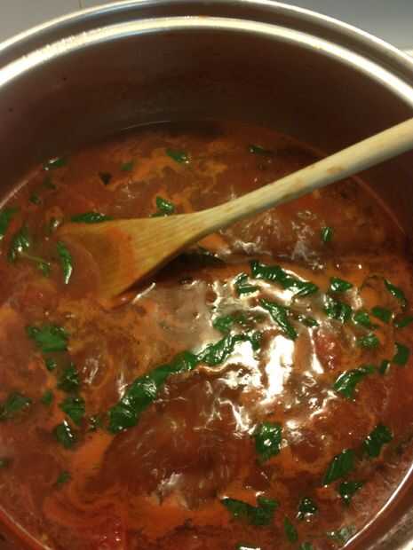 Añadir la lata de los tomates, así como una lata de agua. Una vez que se calienta la mezcla de tomate, añadir las verduras hacia atrás con la albahaca.