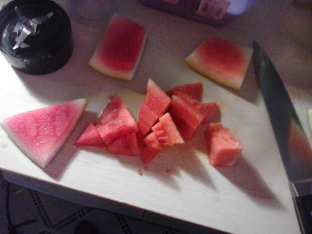 Después de que haya quitado toda la piel y parte blanca de la sandía comienza a cortar el resto de la sandía en triángulos o cuadrados. (Repita este paso hasta que la sandía completa es picada).