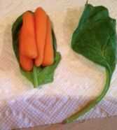 Una de las hojas de espinacas/lechuga poner sobre una superficie y poner tantas verduras apiladas como usted puede sobre él. Utilicé las zanahorias como mi fuente de verduras, sólo tengo una torre de cuatro. Asegúrese de que la hoja sigue mostrando en el exterior. Es importante.