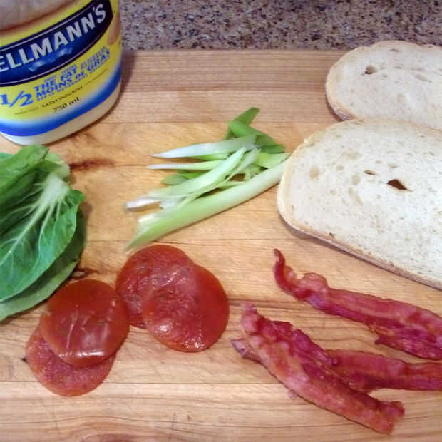Me gusta mezclar cosas, usé bok choy (también conocido como pak choi) en vez de lechuga, gel de tomate vodka en lugar de tomates aburridos y añadido cebolla y pimienta molida. Oh y el tocino, obviamente.