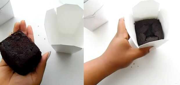 Si no tienes contenedores extras para hornear en: hornear una bandeja pequeña hoja de pastel en un horno de 350 grados durante unos 20 minutos o hasta que un cuchillo insertado en el centro, éste salga limpio. Después de la torta se cuece al horno y refrescado, medir el tamaño del envase para llevar y cortar pastel según medidas. Esto es una gran manera de crear un pastel de capa en el envase. Añadir tantas capas al contenedor como usted quisiera.
