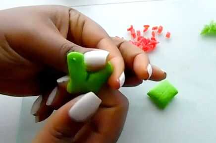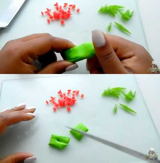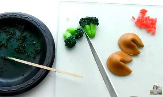 Corte lo laffy taffy a la mitad para crear dos piezas de brócoli separado. Haga un corte aproximadamente 3/4 del camino y cuidadosamente separó las piezas apartes.
