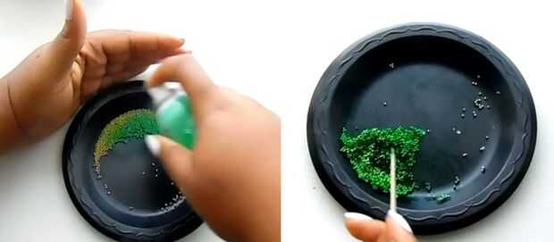 Nota: sólo tenía dragees oro pero logró les color verde rociado con pintura en aerosol verde comestible y cubriendo con polvo de pétalos verdes.