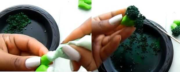 Poner la pequeña cantidad de betún en una bolsa de sándwich color verde y cortar un pequeño rincón para un punto en ambos extremos del brócoli de la pipa. Sumergir los extremos helados en grageas verdes y cubra totalmente.