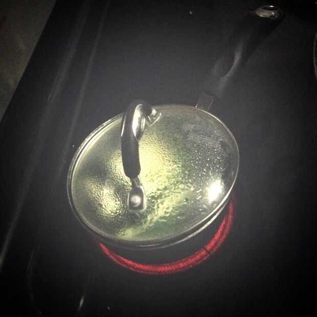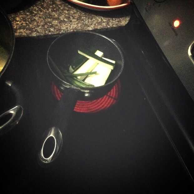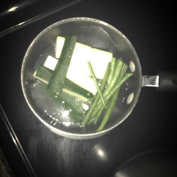 1. poner las verduras (judías verdes, zanahorias, brócoli y el calabacín) en la sartén. Agregue agua, conversión de la cacerola para cocinarlas a fuego lento. Espere unos minutos.