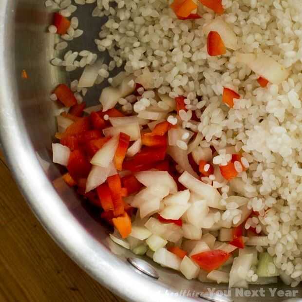 - Vierta aceite de oliva en una cacerola mediana. Caliente a fuego medio durante 1 minuto. Añadir todos los ingredientes. Saltear durante 3 minutos, raspar cualquier arroz de la parte inferior de la olla.
