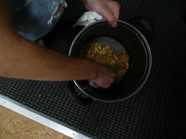 Gramos unas galletas (o Sorbetos de vainilla u otro cookie light/desmenuzable y sabrosa) y aplastar. Josh demuestra su método de Maja de mortero y la mano de bote.