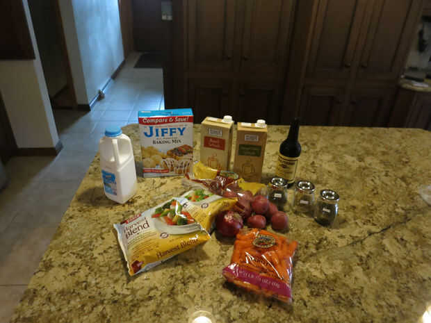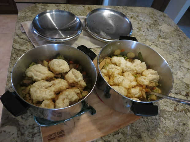 Guiso de carne y bolas de masa hervida es una de las comidas favoritas-comida de mi familia. Durante los años, yo he sustituido ocasionalmente pollo para carne y dos comidas de olla de uno son igualmente deliciosas. Haciendo de estos guisos de carne de pollo con bolas de masa hervida tomó menos de 40 minutos en total, del tiempo de preparación a la hora de la cena.