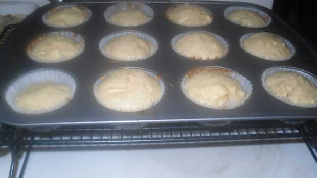 Ahora comenzar a añadir la mezcla de harina a la mezcla de manzana en tercios, batir hasta combinar después de cada uno.  Deje caer bateador por la cuchara colmada en las latas de la Magdalena hasta que son dos tercios completo.