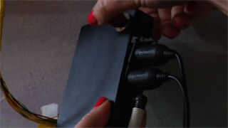 Atornille en su canal en U con los sensores de IR mirando hacia abajo a la tapa 2 x 4. Tornillo en la parte inferior canal en U en la parte inferior 2 x 4. Ahora ancla el Miditron a la pared. Nos escondimos nuestro bajo una pandereta. Corte y pele los cables, para que alcancen el MidiTron, dejar holgura para que no saque los sensores.
