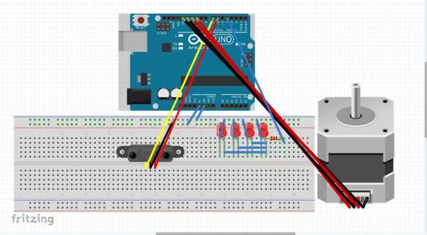 Ahora vamos a conectar el motor paso a paso. El motor tiene 4 cables. De izquierda a derecha, conecte los cables a los pines de Arduino 10, 12, 11 y 13. Este motor facilitará el movimiento de la tabla de surf.