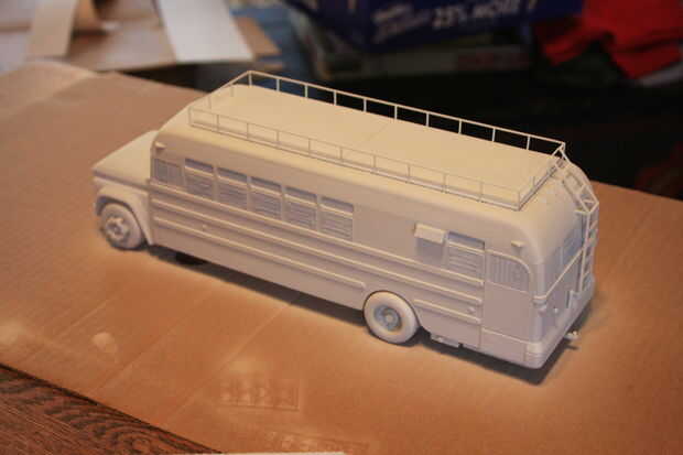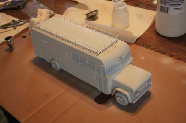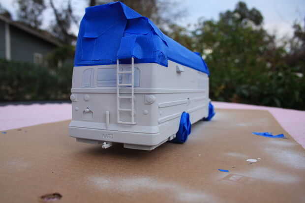 Decidí primero rociar una capa de base blanca. Ocultan todas las ventanas para dejarlos transparentes. Asegúrese de leer las instrucciones en la pintura y delgado con la consistencia adecuada para que fluirá a través de tu aerógrafo. No recuerdo con certeza, pero creo que usé 2 partes de diluyente a la pintura parte 1. También tuve una presión bastante baja de alrededor de 20 libras. Usted debe hacer algunos aerosoles de prueba en la cartulina antes de comenzar con el modelo. Capas finas de spray y construir para arriba lentamente para evitar funcionamientos en la pintura.