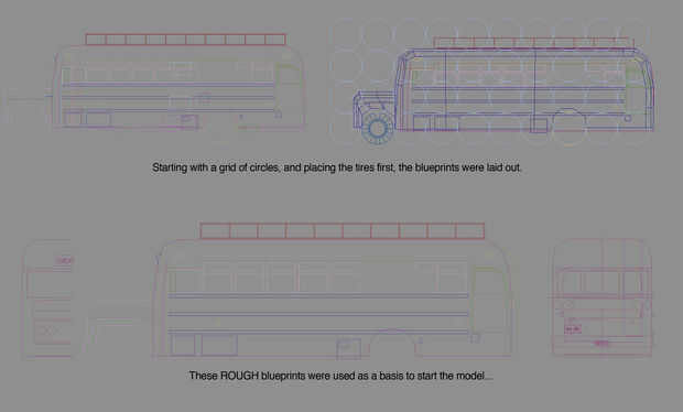 Abrir 3DS Max y crea una spline de círculo del tamaño que necesitaba en la vista lateral. Entonces hice una cuadrícula de círculos, y traté de dibujar en todos los elementos principales del autobús. Los círculos le dan una buena idea donde cada línea de cuerpo, ventana, etc se encuentra en relación con otro. Usted tendrá que ajustar la perspectiva, pero esto realmente ayuda. Su lo mismo que utilizar esta técnica para el dibujo de una foto: http://drawsketch.about.com/od/drawinglessonsandtips/ss/griddrawing_4.htm