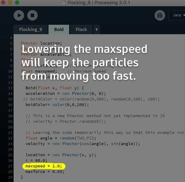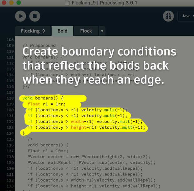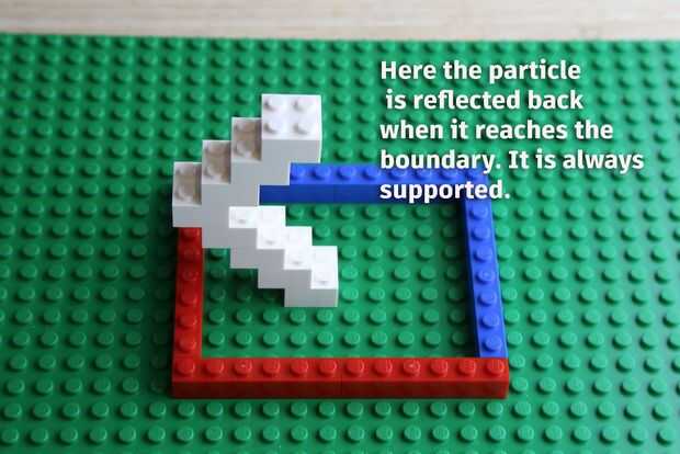 Otro problema con nuestro bosquejo actual es las condiciones de límite. En la actualidad, cuando las partículas dejan el lado izquierdo de la pantalla de que enrolle alrededor a la derecha. Que será un gran problema al intentar imprimir: cuando una partícula se envuelve es repentinamente en el aire y porque no se caerá. En cambio hacer simple las condiciones de contorno (en la foto) que reflejan las partículas de vuelta cuando el enfoque de un borde. El asegura que una partícula en una determinada capa siempre será, al menos parcialmente, sobre la capa anterior.