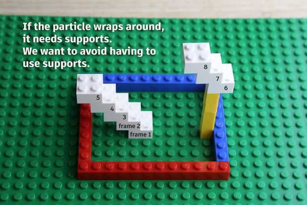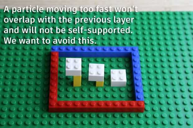 Puesto que la impresión 3D es un proceso de capa por capa, cuando se imprime una capa debe ser compatible con la capa debajo de ella. Una partícula parado o lo moviéndose lentamente formarán una columna recta o angular, esto es grande y no va a ser ningún problema al imprimir. Si la partícula se está moviendo demasiado rápido, tan rápido que se mueve hasta ahora en un solo cuadro que no hay ningún traslapo con el cuadro anterior, no será capaz de sostenerse. Nos a evitar que esto suceda por bajar la velocidad máxima de una partícula.