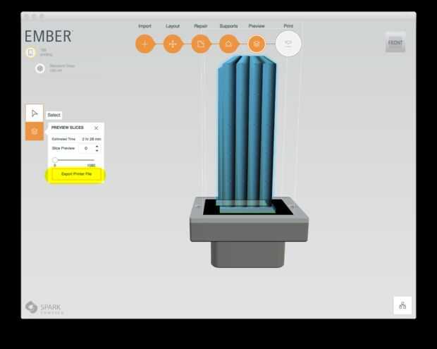 Un archivo de impresión de Ember es un archivo comprimido (ya sea .zip o. tar.gz) que contiene un archivo de texto llamado "printsettings" y una serie de PNG de etiquetado "slice_1.png", "slice_2.png", etc.. Ya hemos creado los PNGs en pasos anteriores. La mejor manera de crear el archivo de impresora Ember es utilizar Print Studio proporciona a través de chispa: https://spark.autodesk.com/