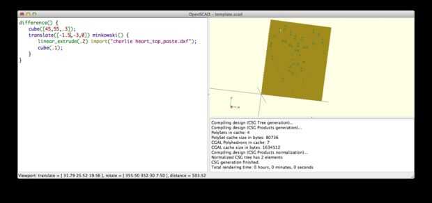 difference() { cube([45,55,.3]); translate([-1.5,-3,0]) minkowski() { linear_extrude(.3) import("charlie heart_top_paste.dxf"); cube(.1); } } Modificar el programa para cambiar el nombre del archivo de la declaración de importación al que guardó en los valores anteriores del paso y x e y del cubo de la segunda línea para el tamaño del tablero con un poco de espacio adicional.