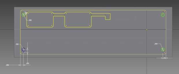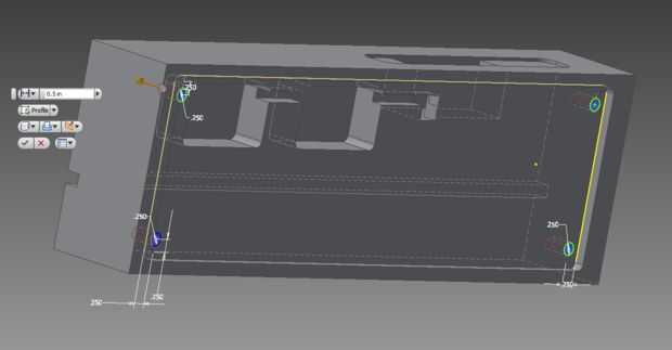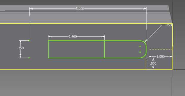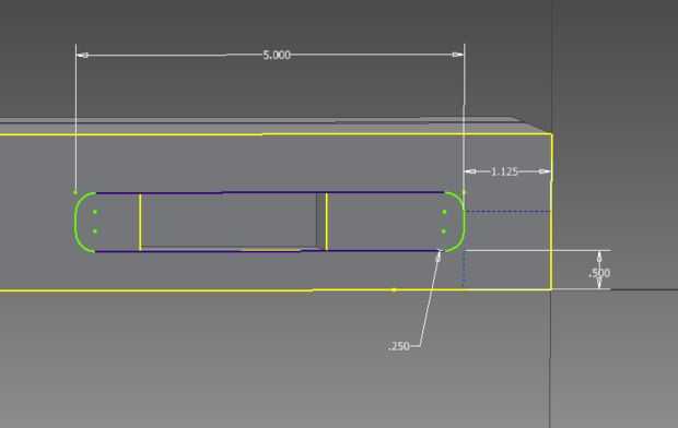 6. en la cara inferior del cuerpo principal, creamos un rectángulo es de 3.5 x 11.5 pulgadas, usando líneas de referencia.5 pulgadas hacia fuera y.25 pulgadas hacia abajo. Luego, se saca este rectángulo.2 pulgadas hacia adentro. Ahora, de las esquinas (indicado por donde el cursor "encaje verde" cuando se cernía sobre) vamos a crear 4 círculos con diámetro de 25 pulgadas que son de.25 pulgadas hacia fuera y hacia arriba y para sacar estos.5 pulgadas hacia el interior de nuestros orificios.