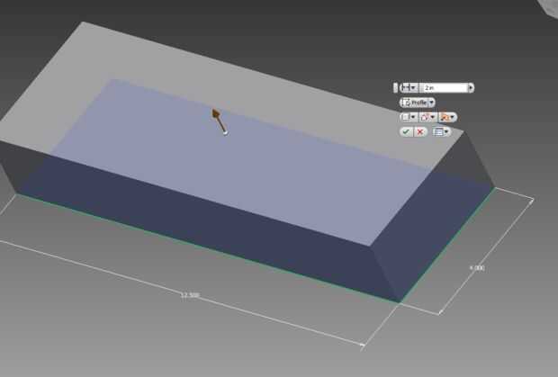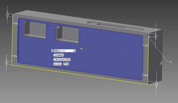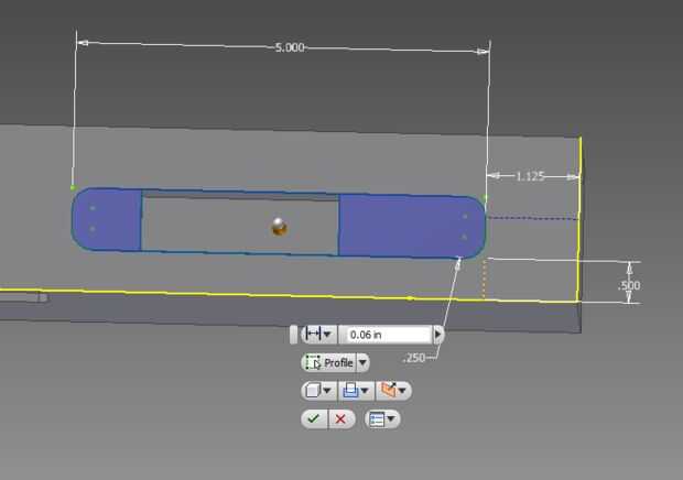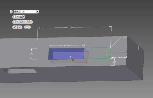 4. ahora vamos a crear un bolsillo para nuestros interruptores. En la cara en el plano XZ del lado lejano de la divet acrílico, crear un rectángulo que es.75 x 5 pulgadas y fileteados.25 pulgadas. Nuestras líneas de referencia son.5 pulgadas para arriba y 1,125 pulgadas hacia fuera de la esquina inferior derecha. Vamos entonces saca este.06 pulgadas. Entonces, 1,772 pulgadas hacia fuera de la mano derecha lado nuestro agujero, haremos un rectángulo de 75 x 2,4 pulgadas. Luego se saca este rectángulo 1 pulgada hacia adentro.