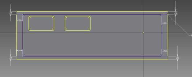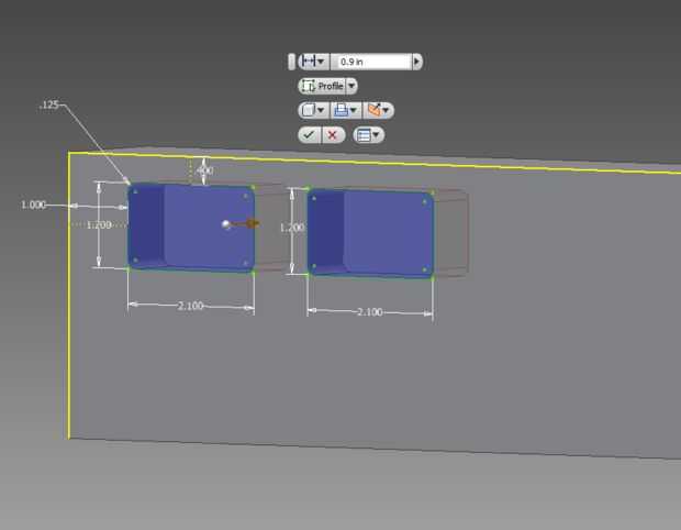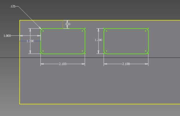 3. en la parte inferior del cuerpo principal, crear un rectángulo 1 pulgada hacia fuera y.4 pulgadas abajo 1.2 x 2.1 pulgadas y fileteados.125 pulgadas. A continuación, crear otro rectángulo que es.9 pulgadas aparte de la primera. Ellos sacan tanto interno.9 pulgadas. Estos serán nuestros bolsillos de batería.