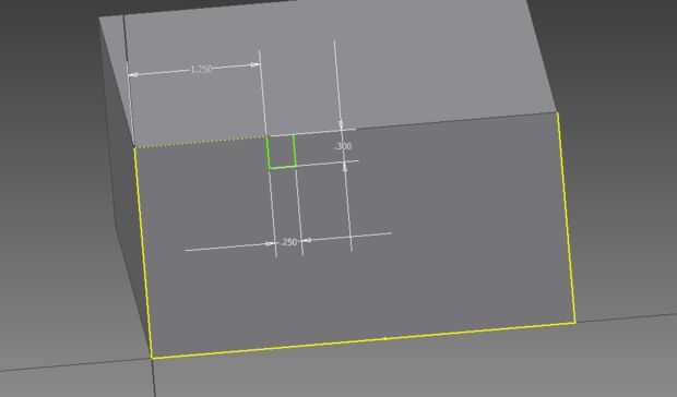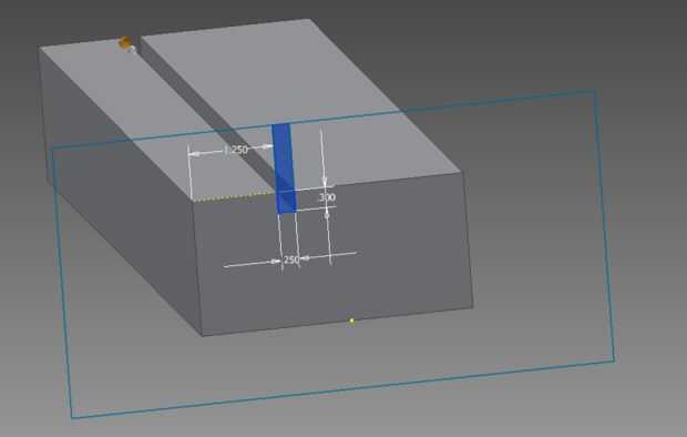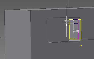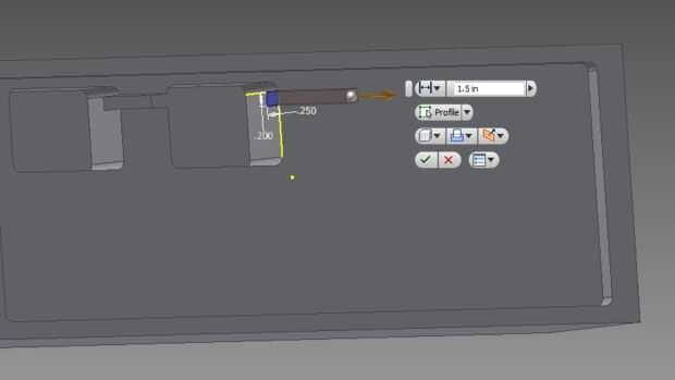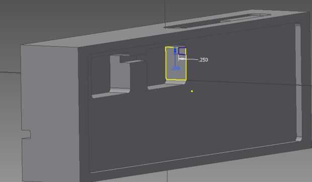 2. en la cara posterior del cuerpo principal, crear una línea de referencia que es de 1,25 pulgadas largo fuera de la esquina superior derecha de la cara. Luego, fuera de la línea de crear un rectángulo es de.25 x.3 pulgadas y extruye a través de la totalidad (todos) del cuerpo principal. Este es nuestro divet acrílico.