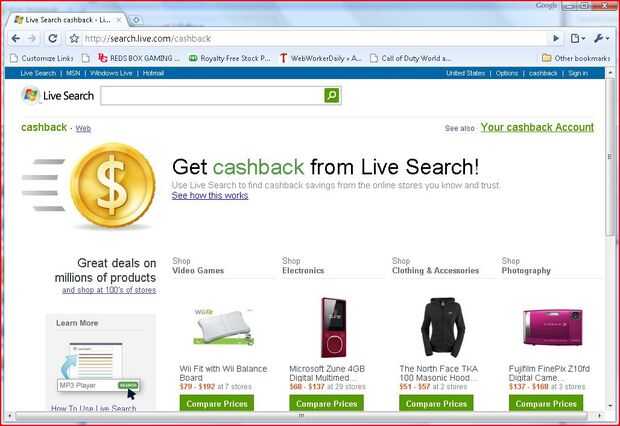 Si vas a la página de Live (www.live.com) verá algo que dice "cashback" en la esquina superior derecha. Esto le llevará a la página de cashback. Puede hacer clic "y tienda a 100 de tiendas" para ver una lista completa de sitios web que admiten reembolso y el porcentaje de reembolso cuando compra algo de estos sitios.